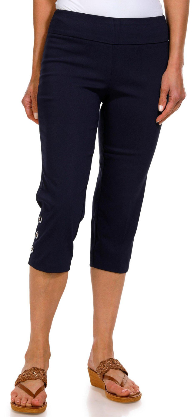 These Womens 20-inch Grommet Capris offer a stylish, flattering fit with a modern twist. Featuring eye-catching grommet details at the sides, they add a touch of edgy elegance to any outfit. The pull-on design ensures comfort, making them perfect for casual or weekend wear.