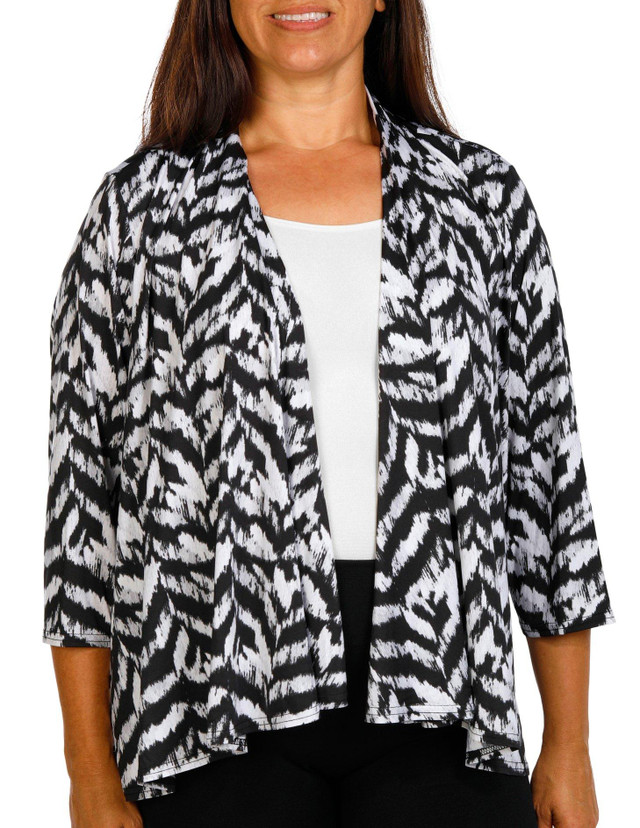 This plus size cardigan features an open front design with three quarter length sleeves, offering a lightweight and stylish layer. The printed pattern adds a pop of personality, making it a perfect addition to both casual and dressy outfits. Fabrication 95% polyester, 5% spandex
