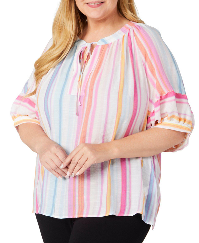 Add a touch of charm to your wardrobe with this Short Sleeve Top. Featuring a vibrant print and a tied neckline detail, this top offers both style and comfort. The playful neckline adds a unique touch, making it perfect for any occasion. Whether you're pairing it with jeans for a casual look or dressing it up with a skirt, this top provides a versatile and chic option that will elevate your outfit effortlessly. Fabrication is 65% rayon, 35% polyester.