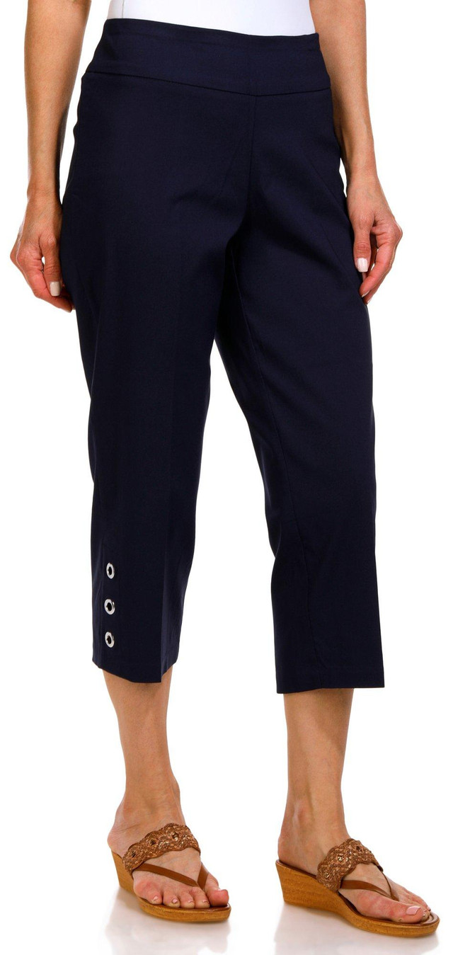 These Womens 21-inch Grommet Capris offer a stylish, flattering fit with a modern twist. Featuring eye-catching grommet details at the sides, they add a touch of edgy elegance to any outfit. The pull-on design ensures comfort, making them perfect for casual or weekend wear.