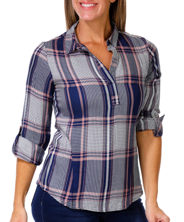 Zac & Rachel Petite 3/4 Sleeve Plaid Johnny Collar Top Bealls Florida