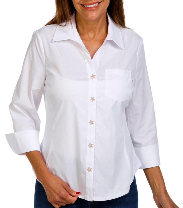 Polished style meets comfort in this lightweight top featuring 3/4 sleeves, starfish buttons with baby pearls, and poplin inserts. The tapered fit and cuffed sleeves create a tailored look that's perfect for both workdays and weekends. Measures approximately 26 in. Fabrication 68% cotton, 27% polyester, 5% spandex.