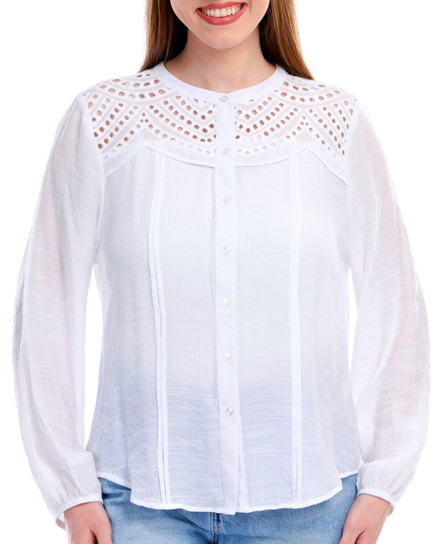 Add a touch of elegance to your wardrobe with this 3/4 Sleeve Top. Featuring open crochet shoulder details, this top offers a delicate and stylish accent. The elastic sleeve cuffs provide a comfortable fit, while the buttoned front adds a classic touch. Perfect for any occasion, this top combines sophistication and comfort, making it a versatile addition to your collection. Fabrication is 65% rayon, 35% polyester.