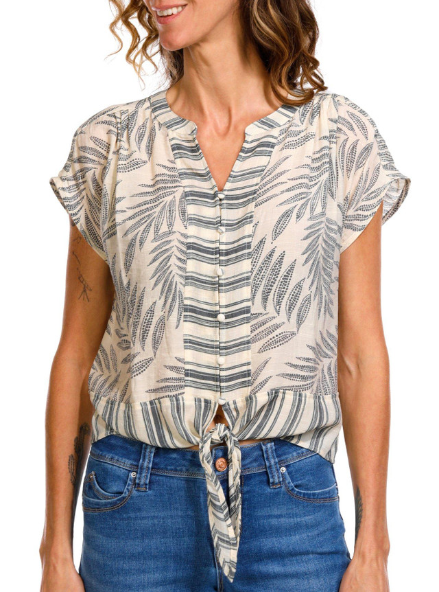 This stylish Short Sleeve Slub Top features a buttoned front, offering versatile styling options. The tie front detail adds a playful touch, while the elegant print helps you stand out. Perfect for casual outings, this top combines comfort and style, making it a delightful addition to your wardrobe. Fabrication is 65% rayon, 35% polyester.