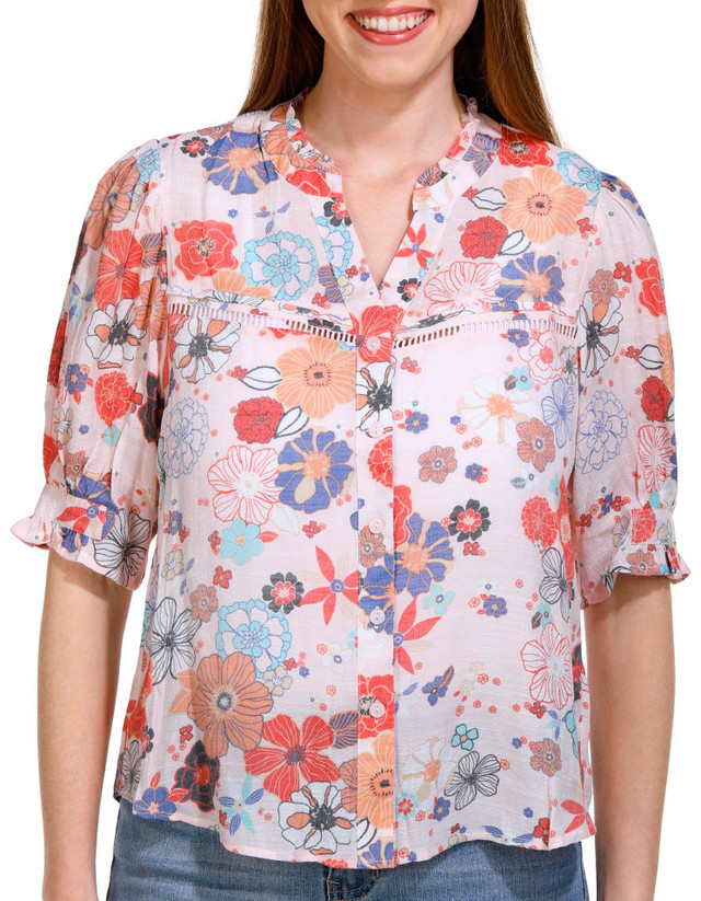 This delightful Short Sleeve Slub Top features a charming print pattern, perfect for adding a touch of personality to your outfit. The buttoned front offers versatile styling options, while the open inset details provide a breezy, elegant touch. Ideal for warm weather, this top combines comfort and style, making it a versatile addition to your wardrobe. Fabrication is 65% rayon, 35% polyester.
