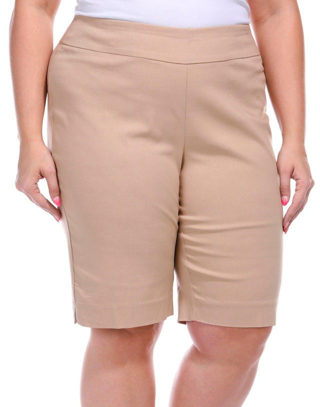 These Pull On Bermuda Shorts are a versatile and comfortable addition to your wardrobe. Featuring a solid color and an elastic waist, they provide a secure and relaxed fit. Perfect for casual outings or active days, these shorts offer both style and practicality. Enjoy the ease and comfort of these classic Bermuda shorts, designed to keep you looking great in any setting. Inseam measures approximately 12 in. Fabrication is 76% rayon, 21% nylon, 3% spandex.