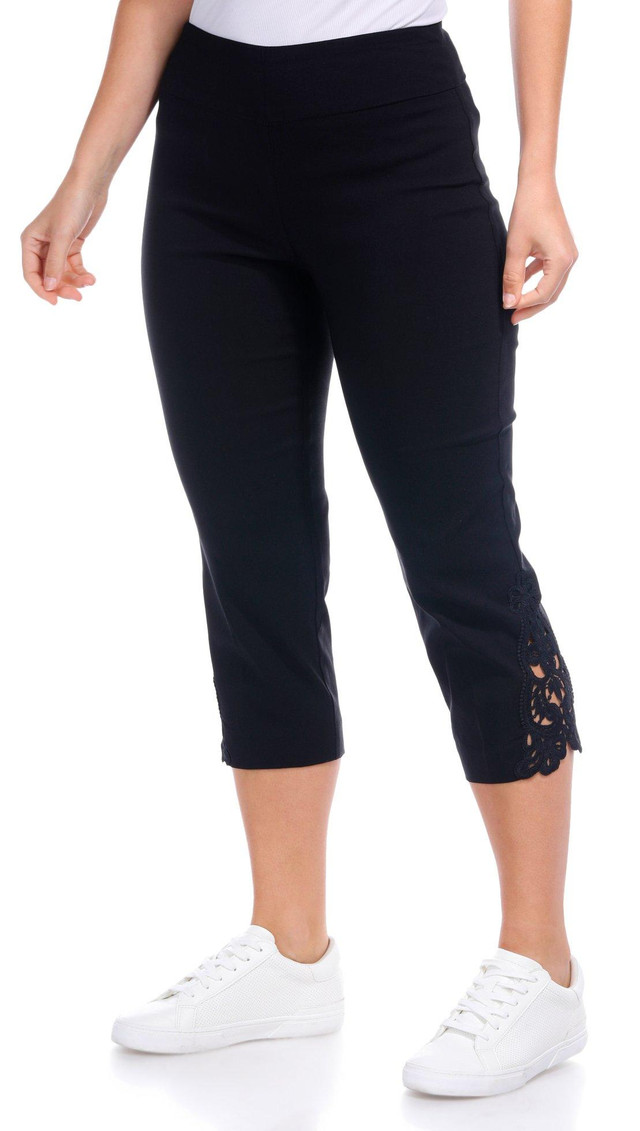 These womens capris feature a solid color with a 22 inch inseam and delicate crochet hem for a touch of elegance. Made of nylon rayon and spandex they offer comfort and stretch making them a great choice for work or casual wear.