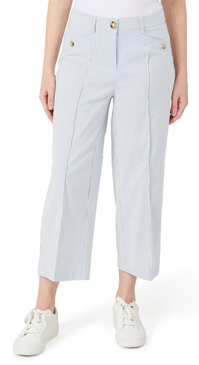 These womens capris feature a striped print with a 24 inch inseam and wide leg fit for a breezy modern look. Made of rayon nylon and spandex they offer comfort and stretch with a button fly zip closure for a classic finish.