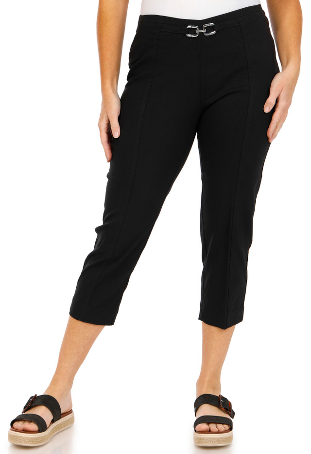 These womens pull on capris offer effortless style with a sleek solid color and a chic gold chain accent on the waistband. Designed for comfort and elegance, they pair easily with your favorite tops for a polished everyday look. Inseam measures approximately 23 in. Fabrication is 76% rayon, 21% nylon, 3% spandex.