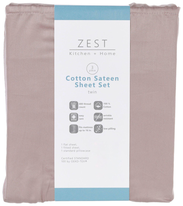 Add timeless elegance to your bedroom with the Zest Kitchen + Home 4-piece (3-piece Twin) Cotton Sateen Sheet Set in a soft solid pattern. Made from 100% cotton, this set includes a flat sheet, fitted sheet, and two pillowcases (one for Twin). The sateen weave offers a silky smooth feel and breathable comfort. Durable, fade resistant, and machine washable, its perfect for year round luxury and subtle style. Fabrication is 100% cotton sateen.