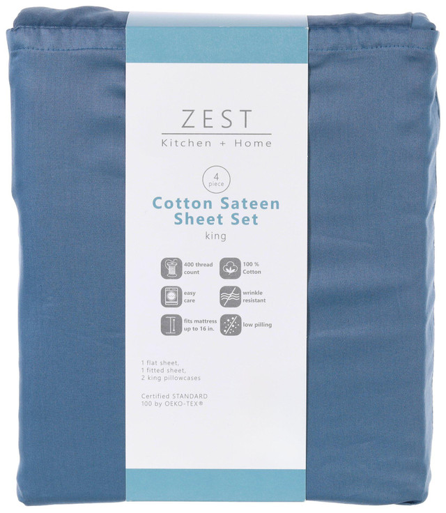 Add timeless elegance to your bedroom with the Zest Kitchen + Home 4-piece (3-piece Twin) Cotton Sateen Sheet Set in a soft solid pattern. Made from 100% cotton, this set includes a flat sheet, fitted sheet, and two pillowcases (one for Twin). The sateen weave offers a silky smooth feel and breathable comfort. Durable, fade resistant, and machine washable, its perfect for year round luxury and subtle style. Fabrication is 100% cotton sateen.