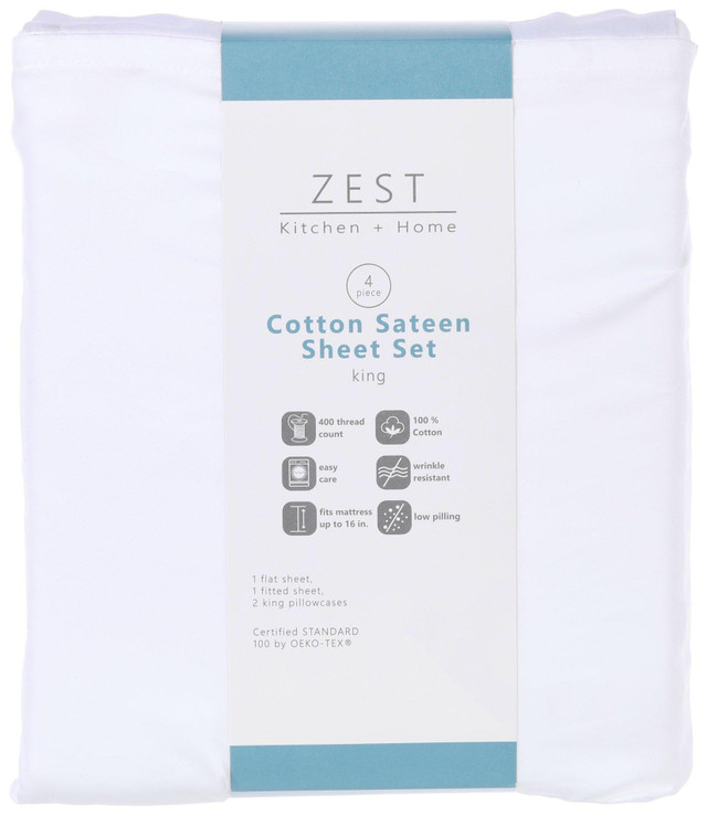 Add timeless elegance to your bedroom with the Zest Kitchen + Home 4-piece (3-piece Twin) Cotton Sateen Sheet Set in a soft solid pattern. Made from 100% cotton, this set includes a flat sheet, fitted sheet, and two pillowcases (one for Twin). The sateen weave offers a silky smooth feel and breathable comfort. Durable, fade resistant, and machine washable, its perfect for year round luxury and subtle style. Fabrication is 100% cotton sateen.