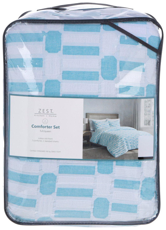 ZEST Kitchen+ Home is designed to help you celebrate life every day. Our passion for quality embodies every product, providing timeless style with a modern touch. Only available at Bealls Florida! The Crescent Comforter Set with matching shams features textured look, highlighted by a white and blue color scheme. A perfect blend of style and serenity. Certified STANDARD 100 by OEKO-TEX.