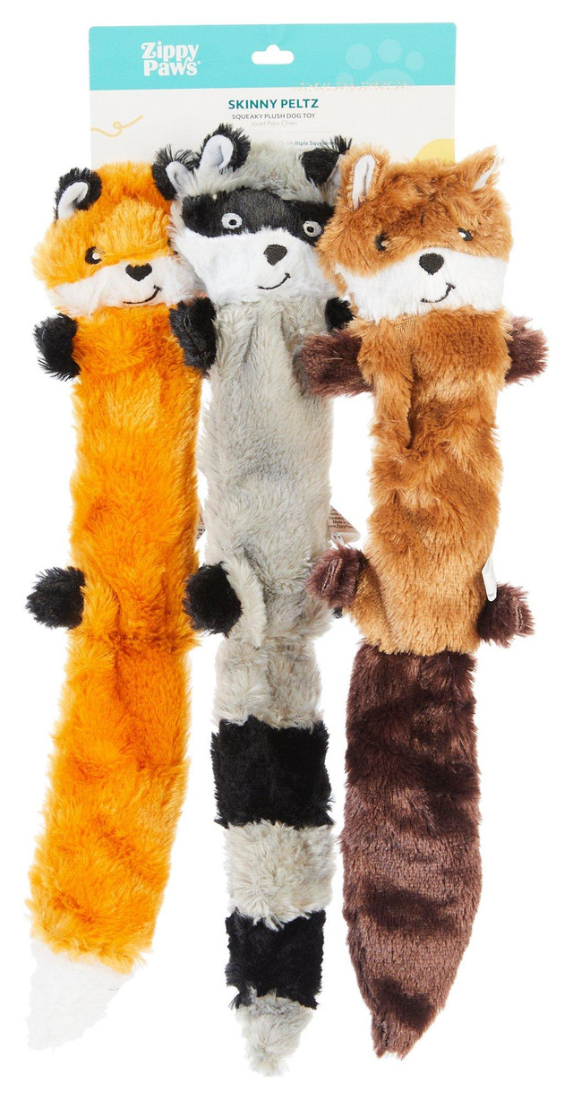 Keep dogs entertained with the 3 Pk Skinny Peltz Squeaky Plush Dog Toys featuring a no stuffing design and multiple squeakers in each toy for extended play. Lightweight and soft for safe indoor fun and gentle chewing. Fabrication is 100% polyester. Each toy measures approximately 18 in x 5 in.