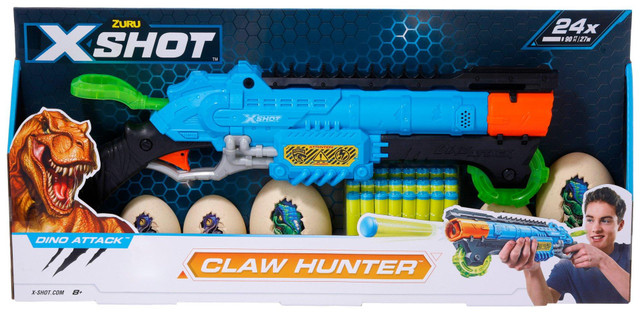 Fuel adventurous play with the XShot Dino Attack Claw Hunter Shotgun Toy designed to launch foam darts up to 90 feet. Includes 24 foam bullets and 6 dino eggs for exciting target practice. Built in dart storage keeps reloads within reach. Recommended for ages 8 years and up.